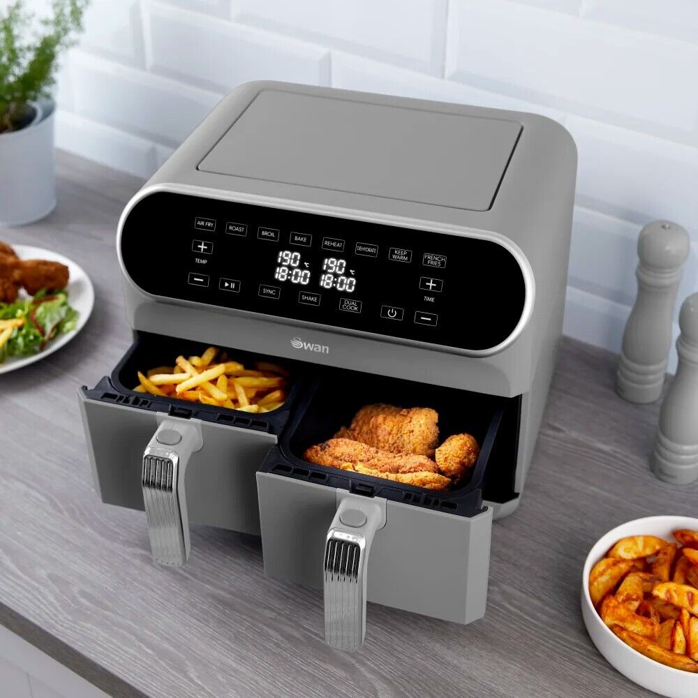 This Swan SD10519GR Retro Grey dual basket digital air fryer is an energy saving alternative to oven cooking. Swan Cyclone Technology creates crispy fried meals with minimal oil needed for healthier results. Features 8 pre-set functions for Fries, Bake, Roast and more. Smart Sync Finish cooks both baskets at once on different times and temperatures but will finish at the same time. Includes shake reminder to keep your food cooking evenly and consistently. The Swan Retro collection is inspired by 1950s and 1960s design to compliment all kitchen decors.