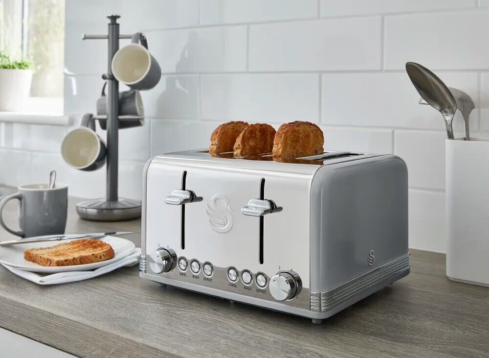 Count on the Swan Retro 4-Slice Toaster for perfectly browned bread every morning. Along with 1600 watts of power, this stylish kitchen appliance has defrost and reheat functions, plus a warming rack, giving you many options on how to prepare your favourite breads. A high-lift eject button ensures your fingers stay safe while automatic shut-off and red indicator lights help keep your toast from burning.