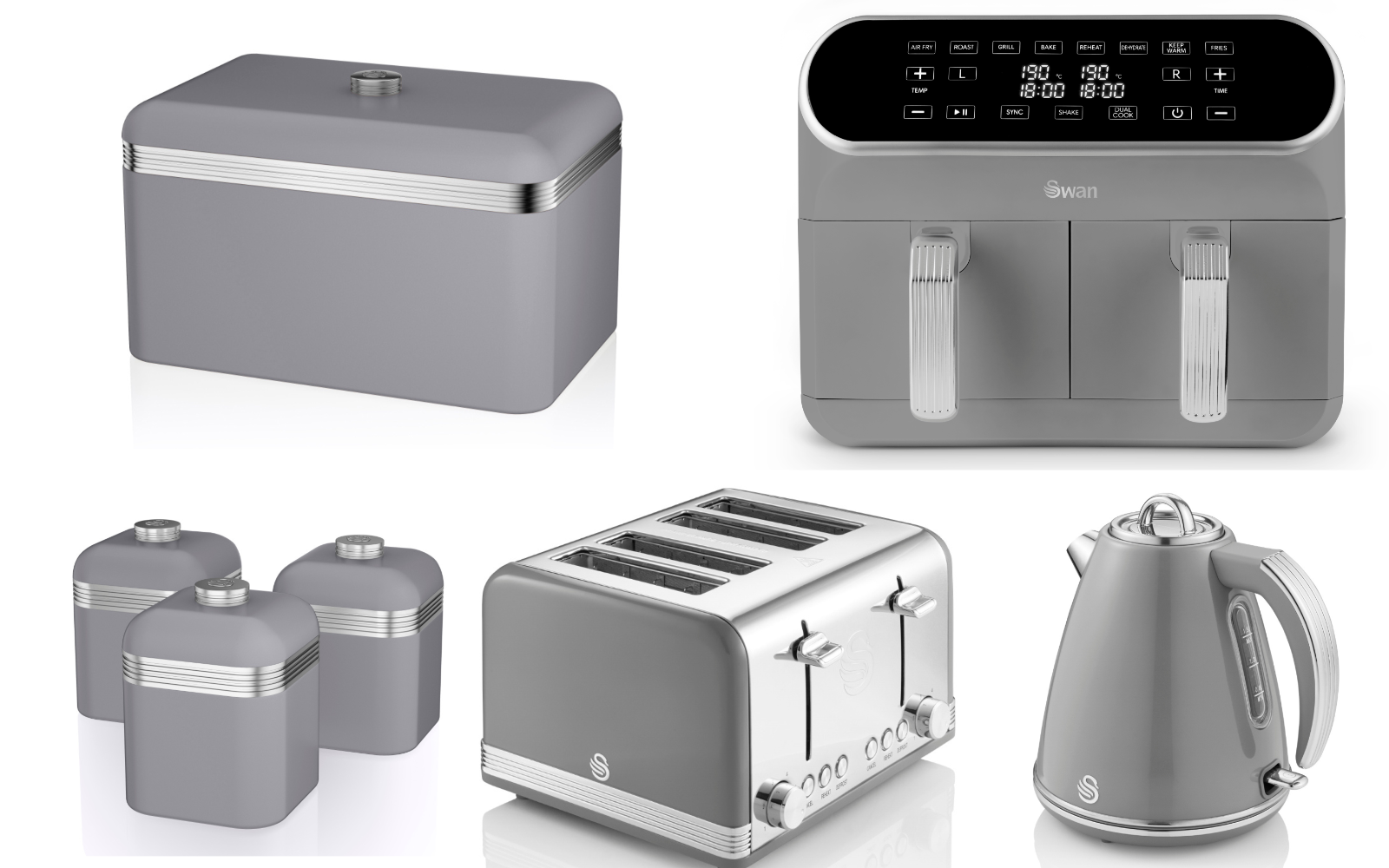 Swan Retro Grey 1.5L 3KW Jug Kettle, 4 Slice Toaster, 8L Dual Basket Air Fryer, Bread Bin & Canisters Set