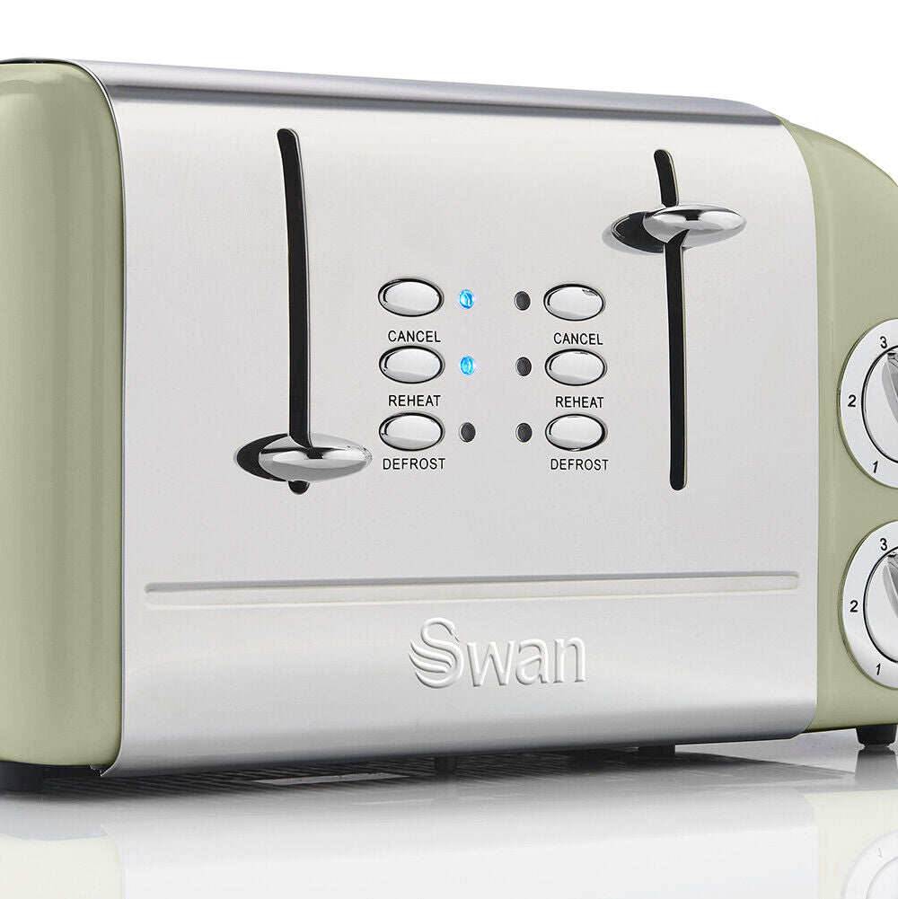 Introduce Swan 4 Slice Retro Toaster to breakfast time! With a cool retro design and 4 slice capacity, it's ideal for the morning breakfast rush.The Swan Retro 4-slice toaster is perfect for the morning breakfast rush! With a generous 4 slice capacity, there is extra space for little mouths and makes romantic breakfasts in bed effortless and easy. Featuring 4 wide slots this Retro toaster can accommodate bread of all sizes, crumpets, bagels, muffins and more. Self-centering slots provide an all-round even browning, whilst the slide-out crumb tray makes for an effortless clean up! Independent electronic browning control ensures your bread is toasted perfectly every time. The high-lift function makes it easier and safer to remove your bread after it has toasted. Handy defrost, reheat and cancel buttons allow for versatile use. So, you can toast straight from frozen or reheat toast without cooking it further.