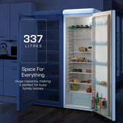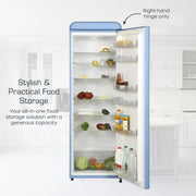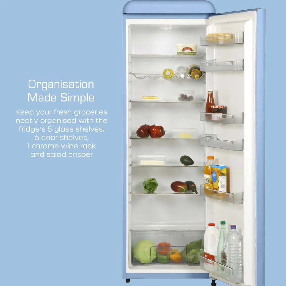 Swan Retro Tall Larder Fridge with 337L Capacity, 5 Glass Fridge Shelves, 1 Chrome Wine Rack, 6 Door Shelves, 1 Salad Crisper, Energy Class E, Blue SR11050BLNE. 2 Year SWAN Manufacturer Guarantee