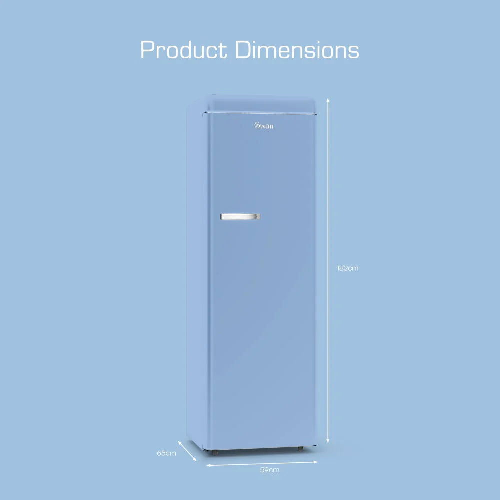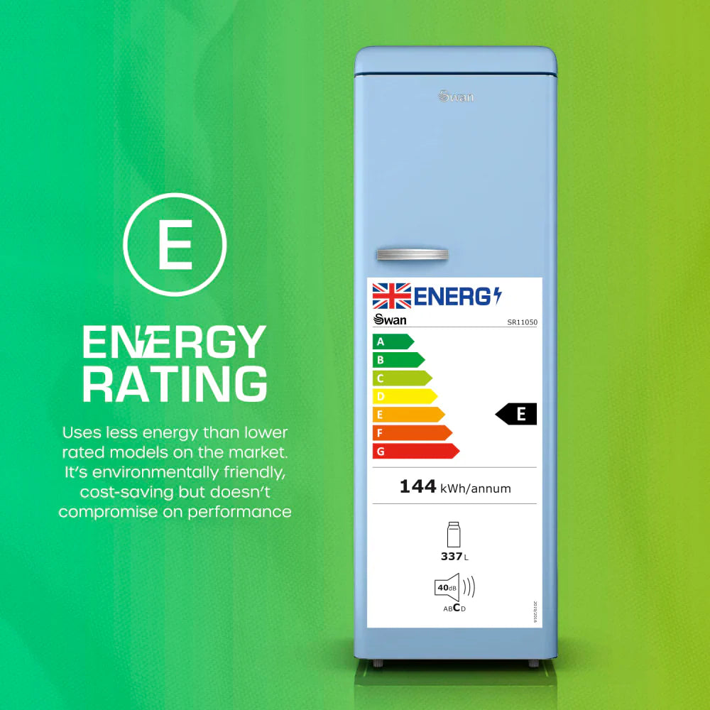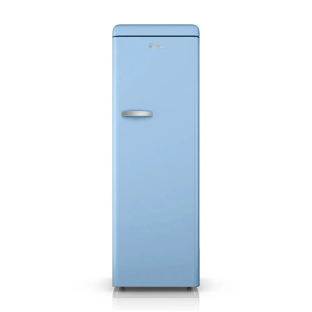 The Swan Retro Tall Larder Fridge combines style and practicality with a large 337-litre total capacity, making it perfect for a busy family home. It includes 5 glass fridge shelves, 1 chrome wine rack, 6 door shelves and 1 salad crisper for organised storage. There’s an adjustable temperature control for varied chilling levels, keeping salads crunchy and beverages refreshing for longer. This retro fridge is also highly economical to run thanks to the E energy rating, making it environmentally friendly and cost-saving without compromising on performance. It also makes a thoughtful and practical gift for newlyweds or people celebrating a new home. The Swan Retro Tall Fridge is a statement piece that does more than just preserve your food; it enhances your kitchen's aesthetic appeal. Its exquisite soft blue exterior, with smoothly rounded corners and a polished metal handle, introduces a splash of retro elegance that complements any décor. Available in a selection of trendy retro shades, it allows for seamless integration into your existing colour scheme.