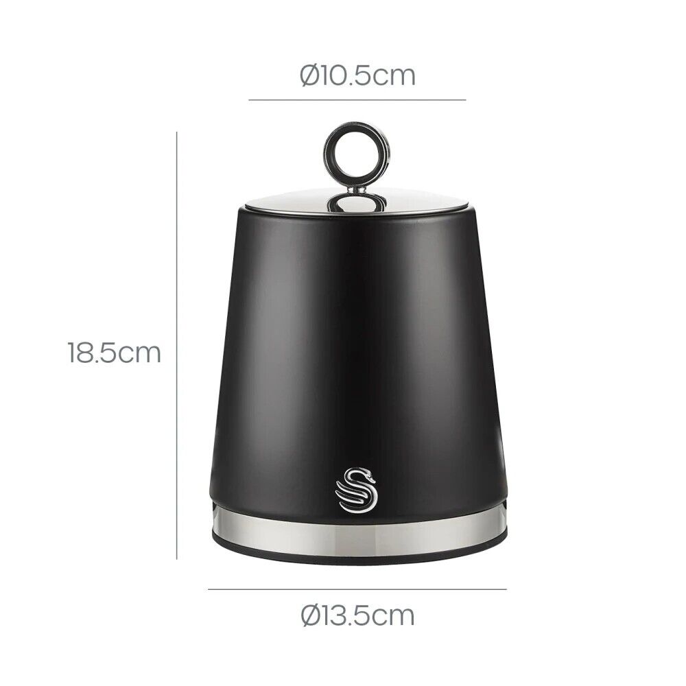 Introduce the Swan Serenity SWKA18536BLK set of 3 black storage canisters to your everyday kitchen collection. Each canister features a 1.3 litre capacity, letting you store large amounts of tea, coffee, sugar or other loose ingredients on your kitchen worktop, all while protecting the contents from dust or moisture. The lids include large sturdy steel loops to grip comfortably, providing you with easy access to the contents. These kitchen canisters combine practicality with an elegant design, offering a contemporary colour scheme to fit perfectly amongst any kitchen decor. All canisters have non-slip feet for added stability and to protect your worktop from scratches. The canisters form part of the Swan Serenity breakfast and storage collection. Swan has been providing high-quality household appliances and kitchenware to millions of homes across the UK for over 100 years