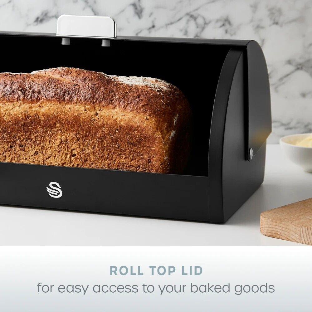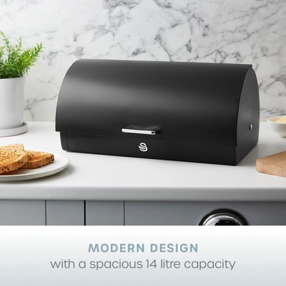 The Swan Serenity SWKA18535BLK black bread bin is the ultimate storage solution to keep your baked goods fresh and easy to access on your kitchen worktop. The lid features a roll top design with large bar handle, making the bread bin easy to open. Its large 14 litre capacity means you can fit a variety of loaves, muffins, bagels, or crumpets at one time, which is perfect for those busy family homes. This large bread bin features ventilation holes at the back, which regulates moisture and facilitates airflow to prevent stale odours, keeping your baked goods fresh for longer. The robust stylish matt smooth body is highly durable for everyday use, while the non-slip feet provide stability on your worktop. It's also easy to maintain, requiring a simple wipe with a damp cloth to clean. The Swan Serenity collection combines our signature Swan design with contemporary matt finish.