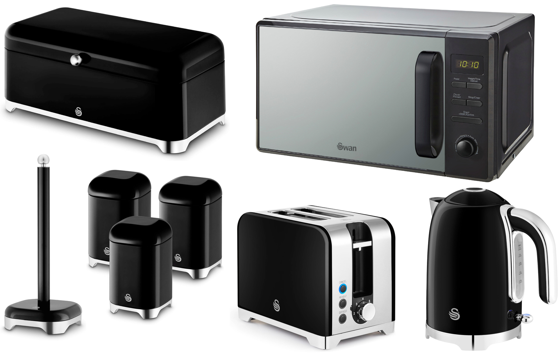 Swan Solace Black 1.7L 3KW Kettle, 2-Slice Toaster 20L 800W Digital Microwave & Matching Kitchen Storage Set