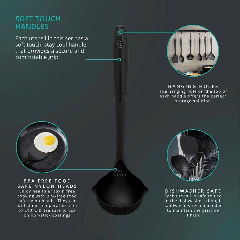 Take the fuss out of mealtimes with this 6 piece Kitchen Tool Set from Swans Stealth collection. This handy set features a spaghetti server, solid spoon, slotted spoon, solid turner, ladle and skimmer to assist you with a variety of everyday cooking tasks. Each utensil has been expertly made from durable nylon which is safe to use on non-stick coatings without causing damage, whilst the soft touch handles provide comfort when cooking and are heat resistant up to 210C for safety when serving. Hanging holes offer the perfect storage solution, whilst handwash is recommended to keep each utensil in this set in pristine condition