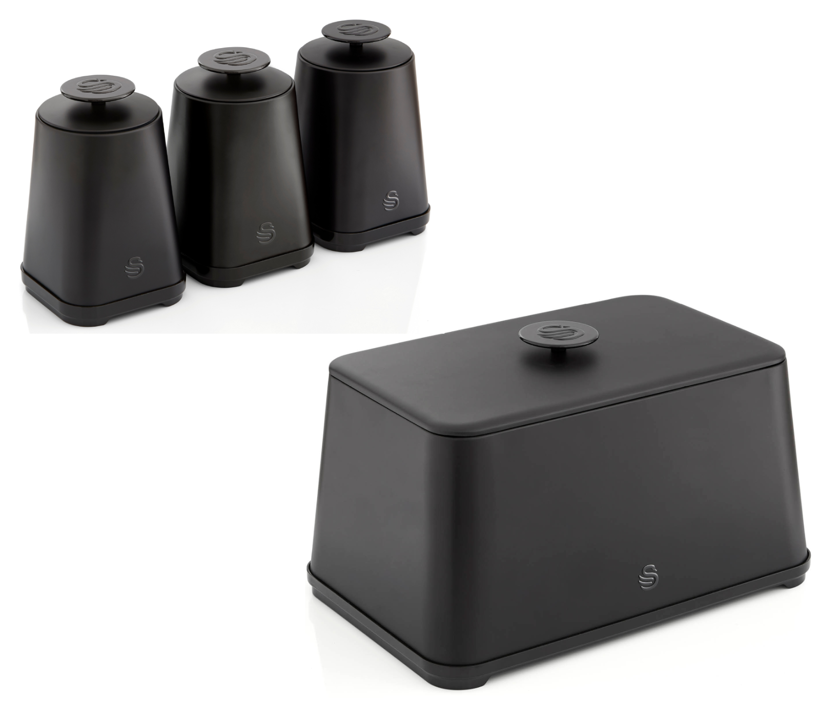 SWAN Stealth Black Bread bin and Tea, Coffee, Sugar Canisters. Contemporary, Sleek and Stylish Matching Kitchen Storage Set
