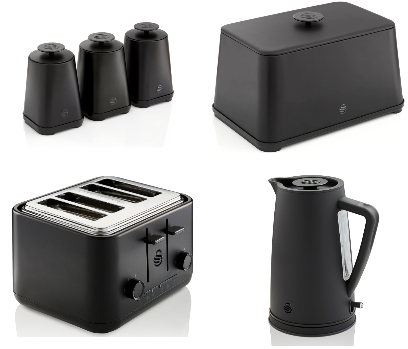 SWAN Stealth 1.7L 3KW Kettle, 4 Slice Toaster, Bread bin, Tea, Coffee, Sugar Canisters. Contemporary, Sleek and Stylish Matching Kitchen Set of 6