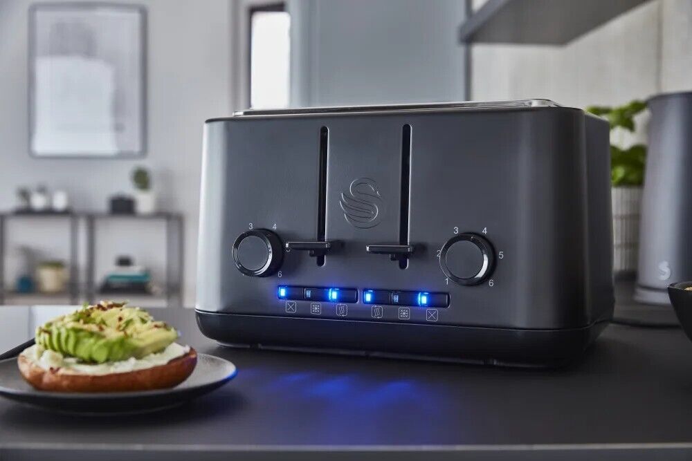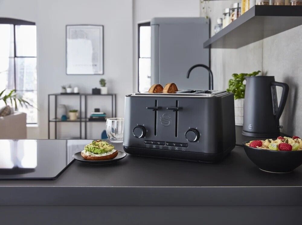 The sleek and contemporary Swan Stealth toaster is the perfect appliance for guys on the go, busy kitchens, and those looking for high performance without having to compromise on style. Its sleek and streamlined design adds a touch of understated class to your kitchen, thanks to the luxurious matt black finish. Top-level design combined with high functionality makes the morning breakfast rush a breeze. The 4-slice capacity means this is the perfect toaster for couples, busy households, or workplaces. Impressive browning controls and adjustable cooking times allow you to toast your bread exactly how you like it every time, and with independent controls for each side, you can adjust the controls on either side based on your preference. The handy removable crumb tray helps to keep your worktop clean and crumb free, and it slides out so you can dispose of all your crumbs quickly and easily. Wide slots and self-centering guide ensure an even brown on bread of all sizes, bagels, crumpets, muffins, and much more.