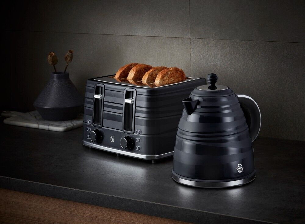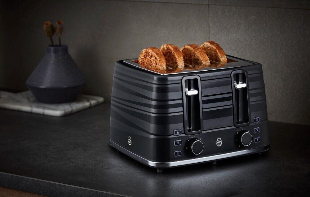 Swan Symphony 4 Slice ToasterPrepare a tasty breakfast for you and the family with this stylish Swan 4-Slice Symphony Toaster. The Swan Symphony 4-slice toaster adds a touch of elegance to your kitchen. Toast up to 4 slices at once, and with independent controls for each side, you can enjoy 2 or 4 slice control. Handy functionality allows you to toast straight from frozen, or reheat toast without it toasting further making cold toast a thing of the past. Electronic browning controls ensure you can toast your bread to perfection every time, no matter your preference. The high lift function makes it easier and safer to remove your food from the toaster for added convenience. A removable crumb tray and cord storage are included to keep your kitchen clean and tidy. Featuring an elegant sweeping ribbon motif with a high gloss and matte finish and chrome detailing, the Swan Symphony 4 slice toaster is an elegant and timeless addition to your kitchen .