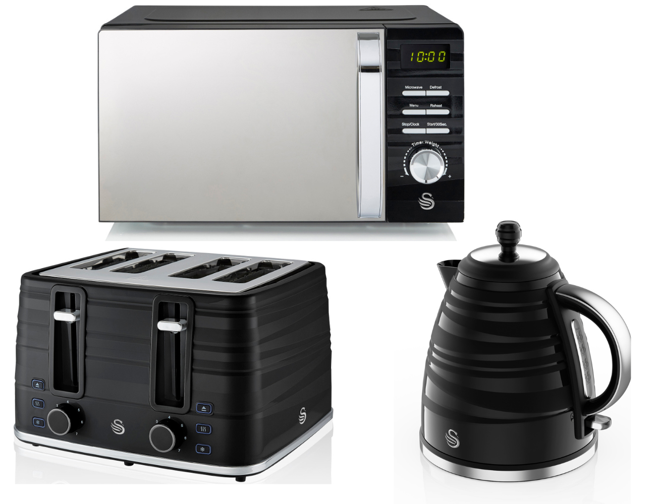 Brand New Swan Symphony Black 3KW 1.7L Kettle, 4 Slice Toaster, 700W 20L Digital Microwave Matching Kitchen Set. Full