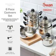 Swan Townhouse 8 Piece Cookware Set - Stainless Steel Silver Pan Set SWPS5027SS