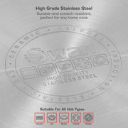 This Swan Townhouse 8 piece stainless steel cookware set is your complete kitchen collection. You get 16, 18 and 20cm saucepans, 14cm Milk Pan, 24cm Frying Pan and 18cm 3 Tier Steamer - all made from durable stainless steel with double pouring spouts. The riveted staycool handles and knobs are comfortable to grip with no risk of burning your hands. With tempered glass lids, you can safely monitor the progress without removing them. Inner capacity markings in the saucepans make it easier to add correct measurements of your ingredients. These are also the best stainless steel pans for all your cooking needs as they are suitable for use on all hob types, including induction, and oven safe for added versatility. Oven safe up to 170C for up to 40 mins. Dishwasher safe for easy cleaning. The Swan Townhouse collection combines striking modern design with beautiful detailing in sleek finishes with coordinated colours.