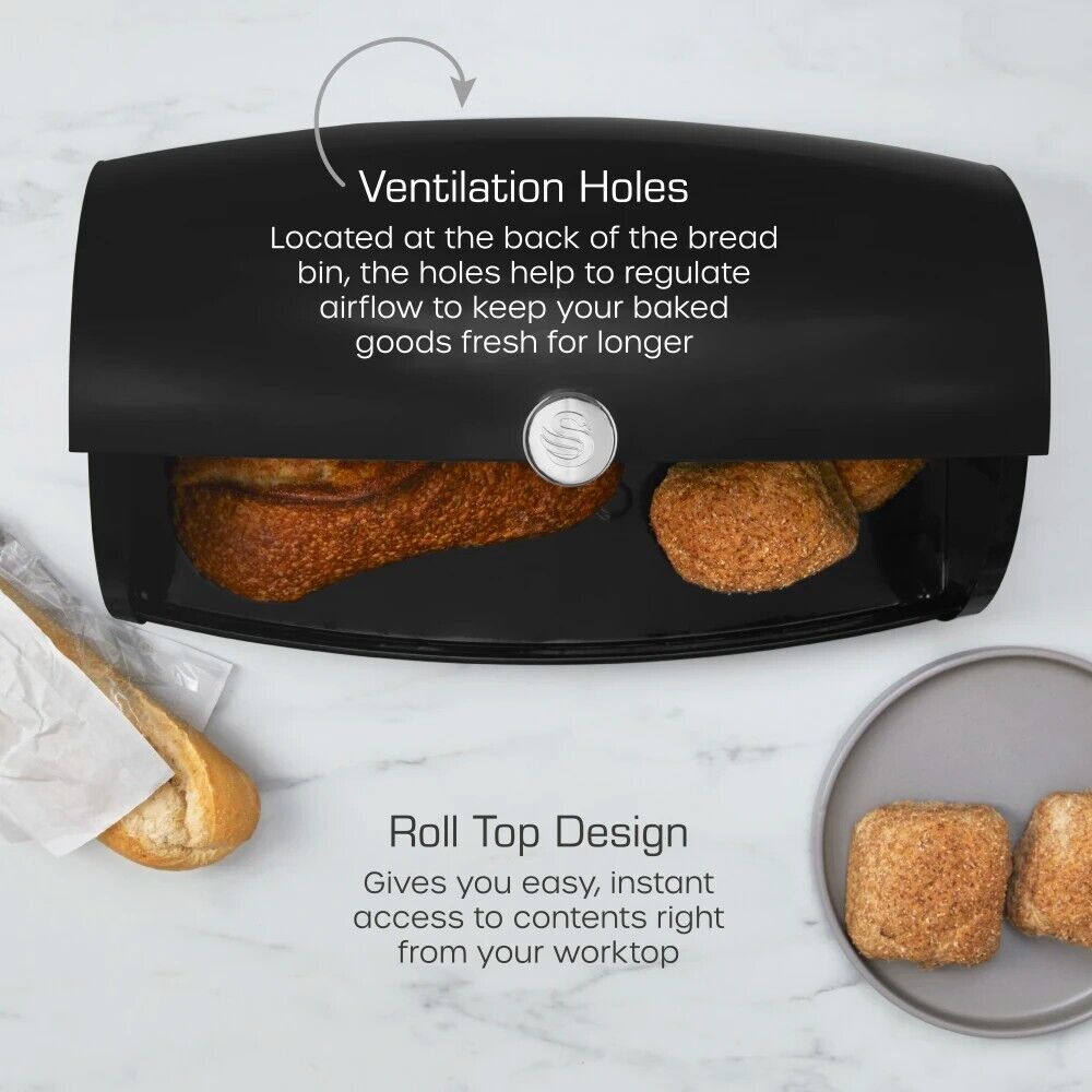 Swan Townhouse Black Bread Bin with Roll Top Lid SWKA18529BLK