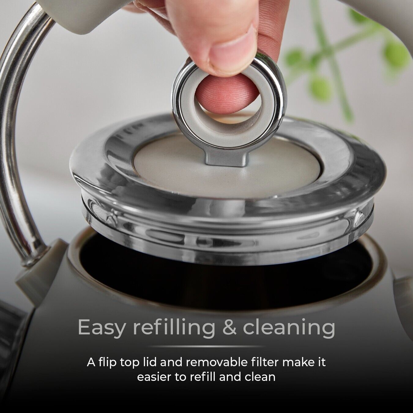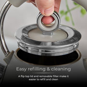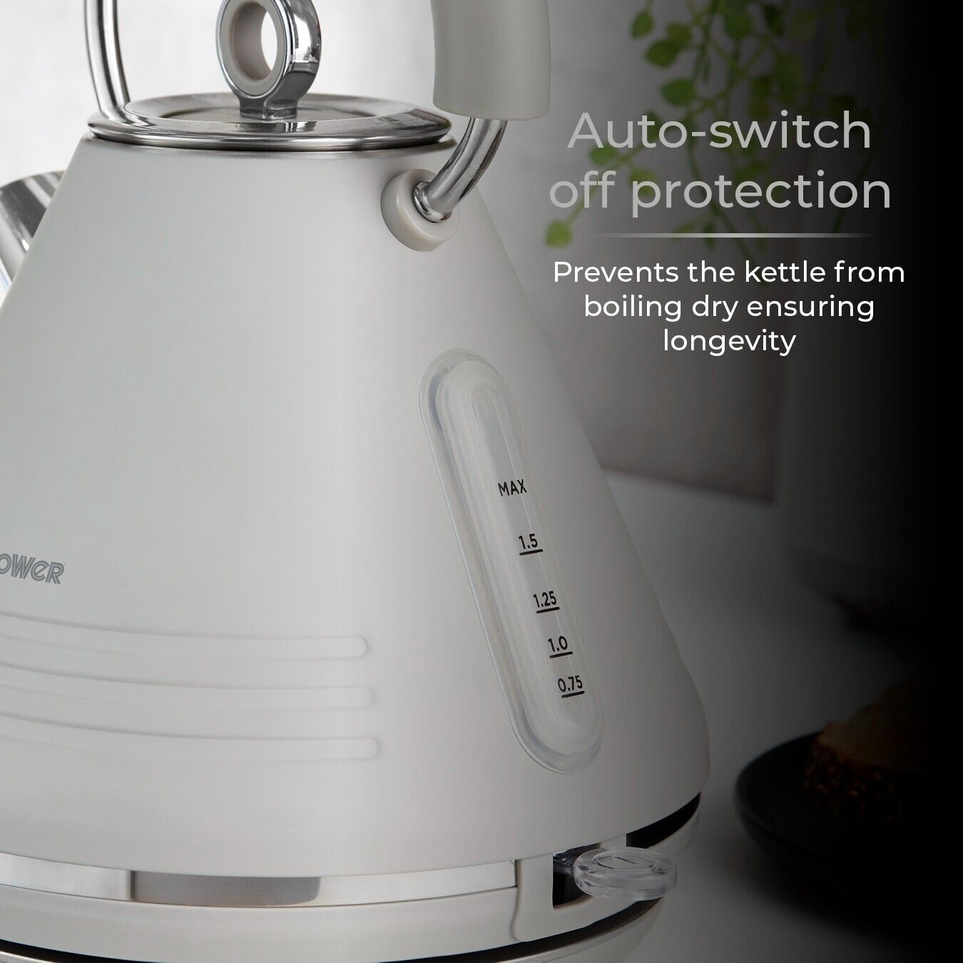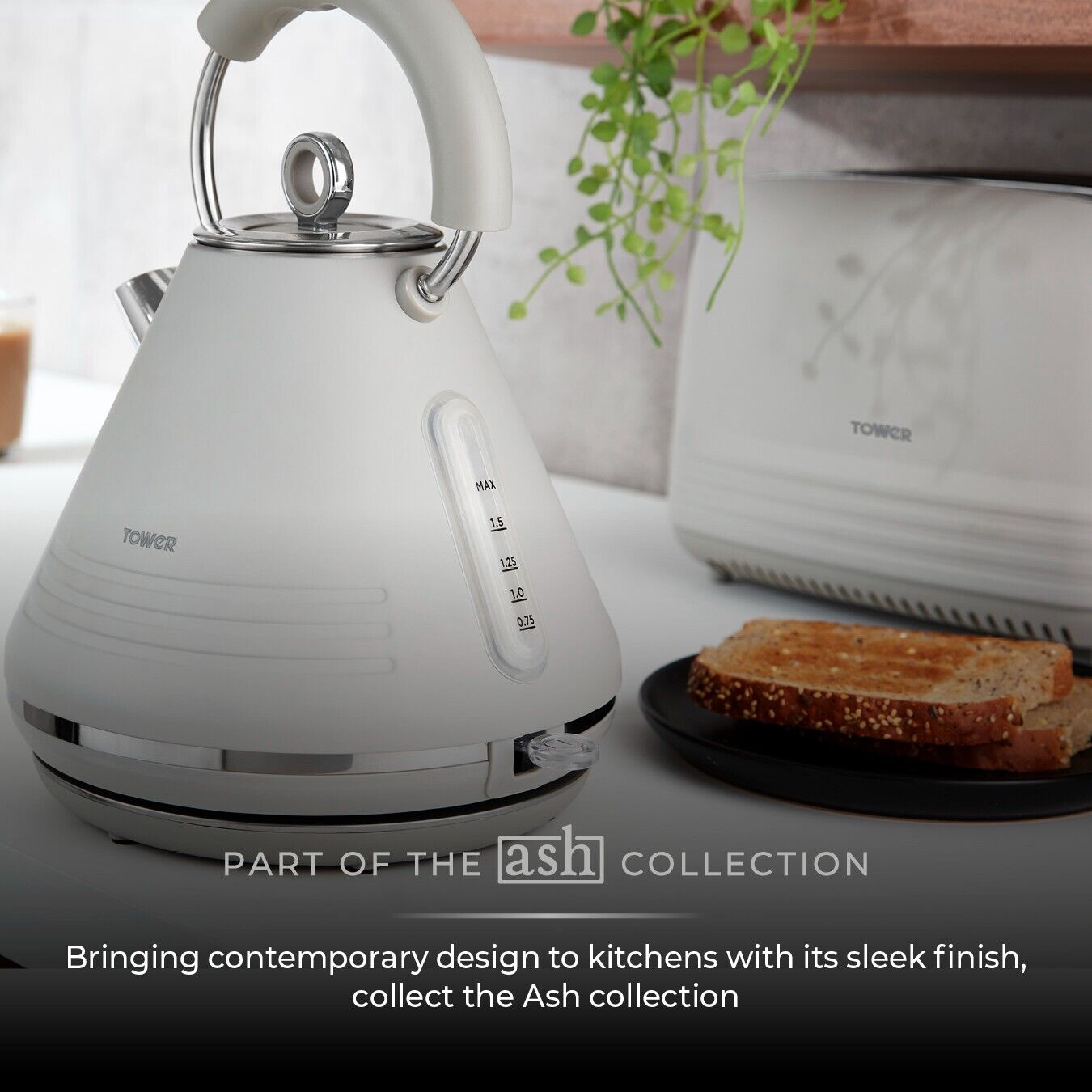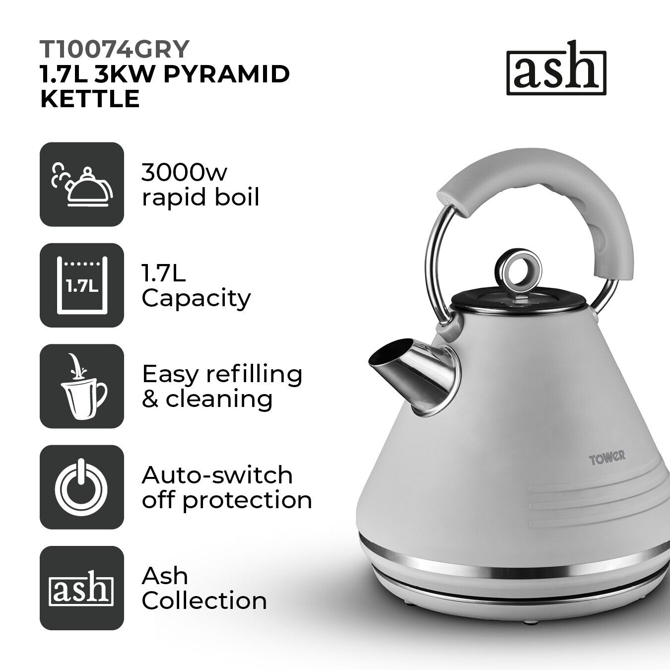 Add contemporary style to your kitchen with this Ash Pyramid Kettle from Tower. It features a sleek grey and chrome body with premium matte finish in a stylish, modern design. Rapid boil technology takes the time out of drink-making, allowing you to boil 1 cup in less than 1 minute. The large 1.7L capacity is perfect for families and busy households, holding enough water to make 7 drinks at a time. It's simple to refill with the flip top lid and comes with a removable filter which can be rinsed under the tap to easily combat excess limescale. Its accessible open handle appearance with 360-degree rotational base makes it comfortable to lift up and refill for both left and right-handed users. |
