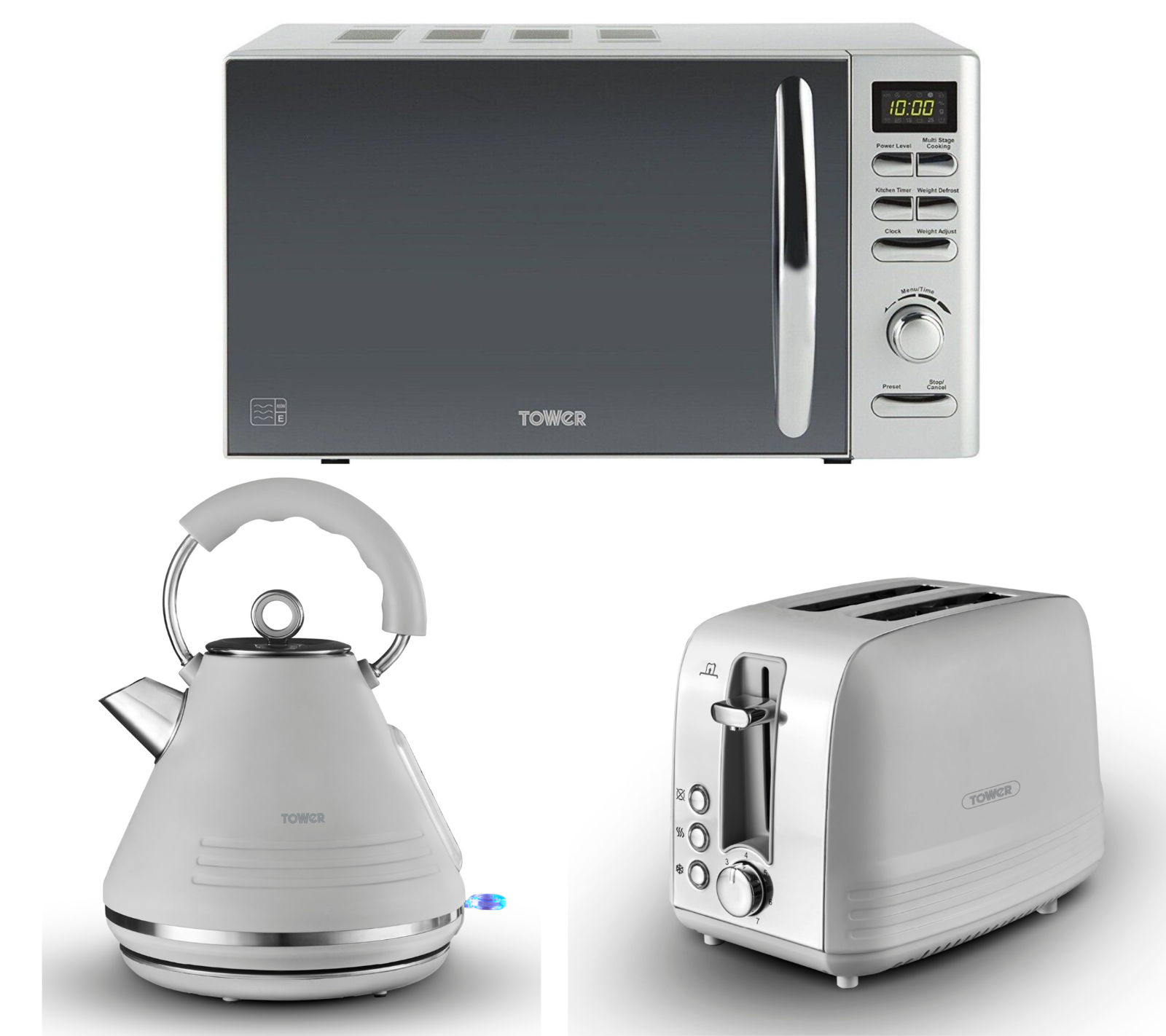 Tower Ash Grey 1.7L 3KW Pyramid Kettle, 4 Slice Toaster & Tower Infinity 20L 800W Digital Microwave Silver. Contemporary & Sleek Design Kettle, Toaster & Microwave Matching Set