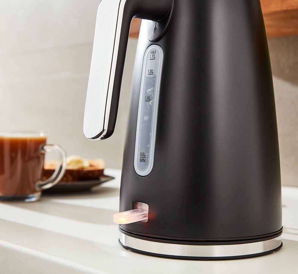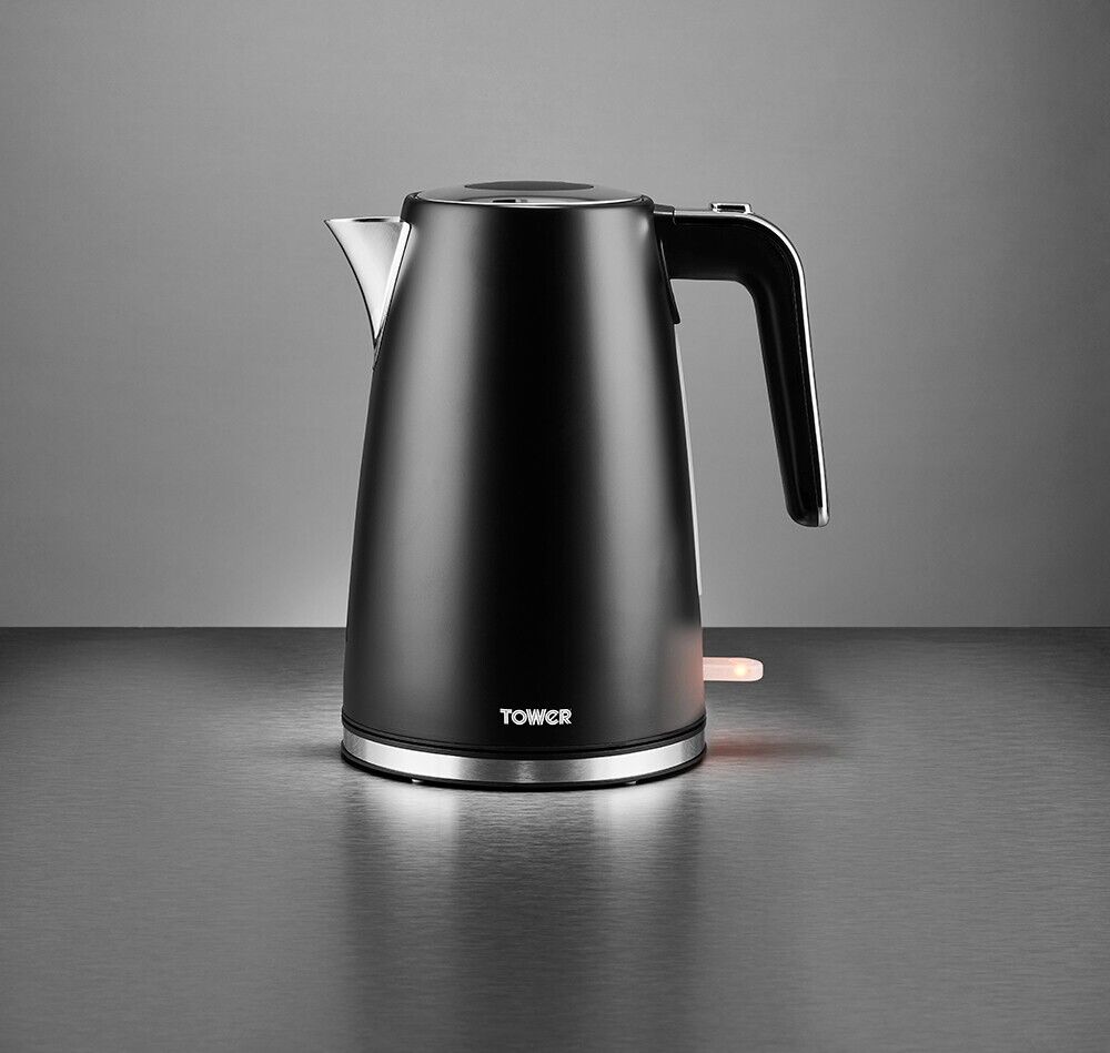 Add contemporary style to your kitchen with this Ash Jug Kettle from Tower. It features a sleek black and chrome body with premium matte finish in a stylish, modern design. Rapid boil technology takes the time out of drink-making, allowing you to boil 1 cup in less than 1 minute. The large 1.7L capacity is perfect for families and busy households, holding enough water to make 7 drinks at a time. Its simple to refill with the flip top lid and comes with a removable filter which can be rinsed under the tap to easily combat excess limescale. Its accessible open handle appearance with 360-degree rotational base makes it comfortable to lift up and refill for both left and right-handed users.