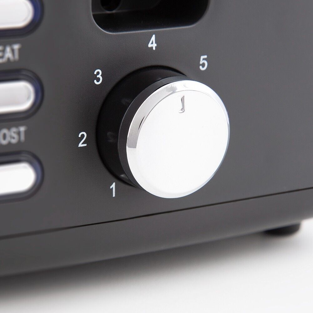 This Ash 2-Slice Toaster brings contemporary style to your kitchen with its sleek black and chrome body and premium matte finish. It features modern design and functionality to make family breakfasts simple, providing 7 different browning levels to create the perfectly-toasted consistency for your bread. A self-centering function keeps each slice aligned inside the slot to ensure even toasting on both sides of the bread. There are defrost and reheat options to toast directly from frozen, or warm up forgotten slices to take the stress out of your morning schedule. A removable tray lets you easily clear out messy crumbs, while the integrated cord storage keeps your wires presented neatly on your counter top.