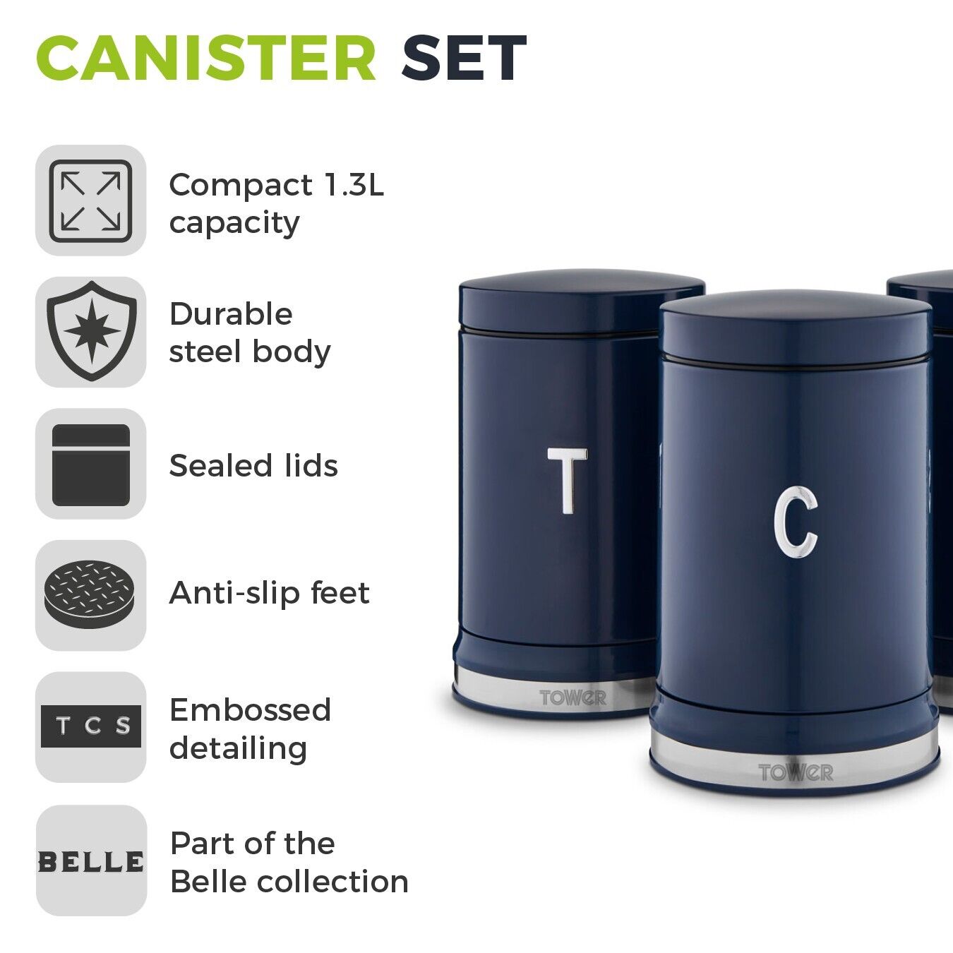 Store your loose ingredients in style with the Tower Belle canister set. The 3 containers feature a bold colourway wrapped around a sophisticated curved design to bring a touch of elegance to your kitchen. Perfect for storing cuppa essentials, the canisters are decorated with embossed T/C/S chrome lettering, keeping your kitchen neatly organised with indication to the contents inside. Each canister has a 1.3 litre capacity to store up to 50 teabags, 1kg of coffee and 1kg of sugar neatly on your kitchen countertop, and its small footprint saves space too. The accessible pull lids can easily be removed to empty, refill and access contents as needed, complete with an airtight lid to seal in the freshness for longer. Built from durable steel with a chrome effect base ring, these containers are designed to last and can be easily wiped clean to protect the finish. Anti-slip feet keep the canisters in place and prevent scratching against your surfaces.