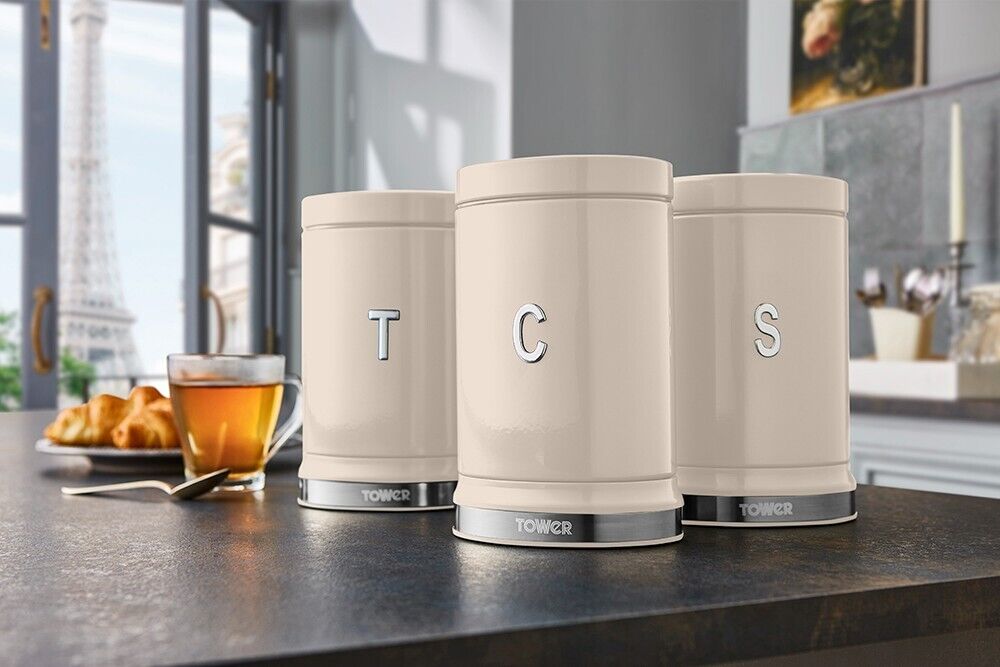 Store your loose ingredients in style with the Tower Belle canister set. The 3 containers feature a bold colourway wrapped around a sophisticated curved design to bring a touch of elegance to your kitchen. Perfect for storing cuppa essentials, the canisters are decorated with embossed T/C/S chrome lettering, keeping your kitchen neatly organised with indication to the contents inside. Each canister has a 1.3 litre capacity to store up to 50 teabags, 1kg of coffee and 1kg of sugar neatly on your kitchen countertop, and its small footprint saves space too. The accessible pull lids can easily be removed to empty, refill and access contents as needed, complete with an airtight lid to seal in the freshness for longer. Built from durable steel with a chrome effect base ring, these containers are designed to last and can be easily wiped clean to protect the finish. Anti-slip feet keep the canisters in place and prevent scratching against your surfaces.