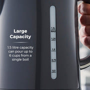 - Generous 1.5L capacity boils up to 6 cups of water at once