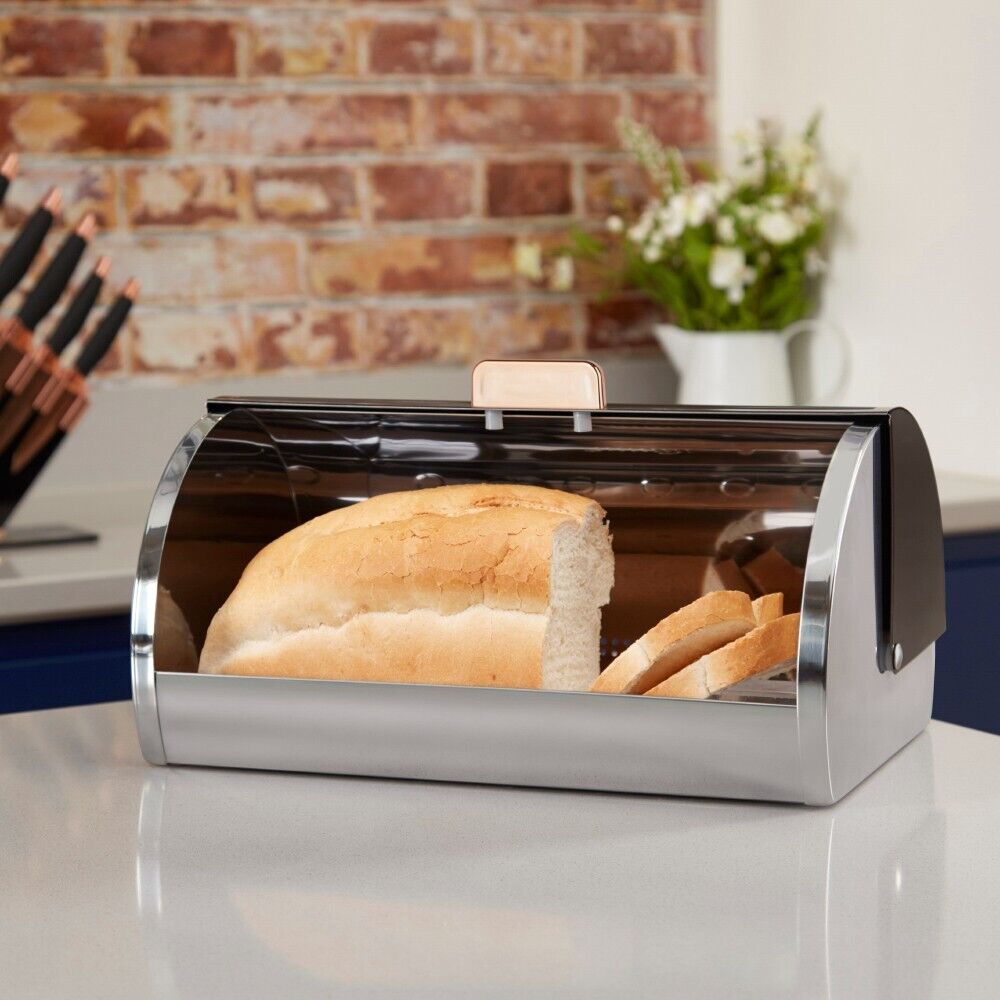 Keep your baked goods in one convenient place with this roll-top Tower bread bin. Built from high quality stainless steel this bread bin is colour coated in a black mirror finish, with our Linear pattern design and a rose gold lid handle to add a stylish touch. Designed with ventilation holes to prolong the freshness of your bread, this bin measures H27cm x W38cm x D19cm and requires only a simple wipe clean to maintain its pristine finish. This Black and rose gold bread bin comes with 3 years warranty to provide added peace of mind in the event of a fault.