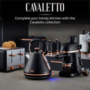 Combining black and rose gold with a durable stainless steel finish, this Cavaletto 4 slice toaster injects a splash of contemporary design into your breakfast routine. The variable browning controls let you select the perfect toasting texture to suit your taste. Defrost, reheat and cancel options put you in control of the toasting cycle, so you can warm up your snacks or toast straight from frozen. The removable crumb tray captures any excess crumbs to make for easy disposal and to maintain the toaster's quality performance. The integrated cord storage keeps your counter surfaces free from trailing wires.