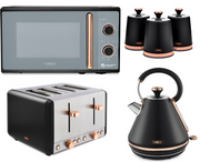 Contemporary Matching Set of 6 Kitchen Items in Black & Rose Gold with 1.7L 3KW Pyramid Kettle, 4 Slice 1800W Toaster, 800W 20L Microwave & Set of 3 Tea, Coffee & Sugar Canisters
