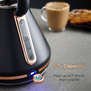 Brew your hot drinks with the 3kW concealed heating element that uses rapid boiling technology to efficiently heat your hot water in no time. The 1.7 litre capacity makes up to 7 cups from a single fill, with a water level indicator window so you can view the contents inside. The high quality stainless steel structure is finished in a black finish with rose gold finishing touches for a splash of elegance to set off your kitchen. The detachable filter can be easily removed when it requires a quick clean, while the pull up lid presents maximum access for ease of refilling. The automatic shut-off and boil dry protection features maintain reliable operation during use.