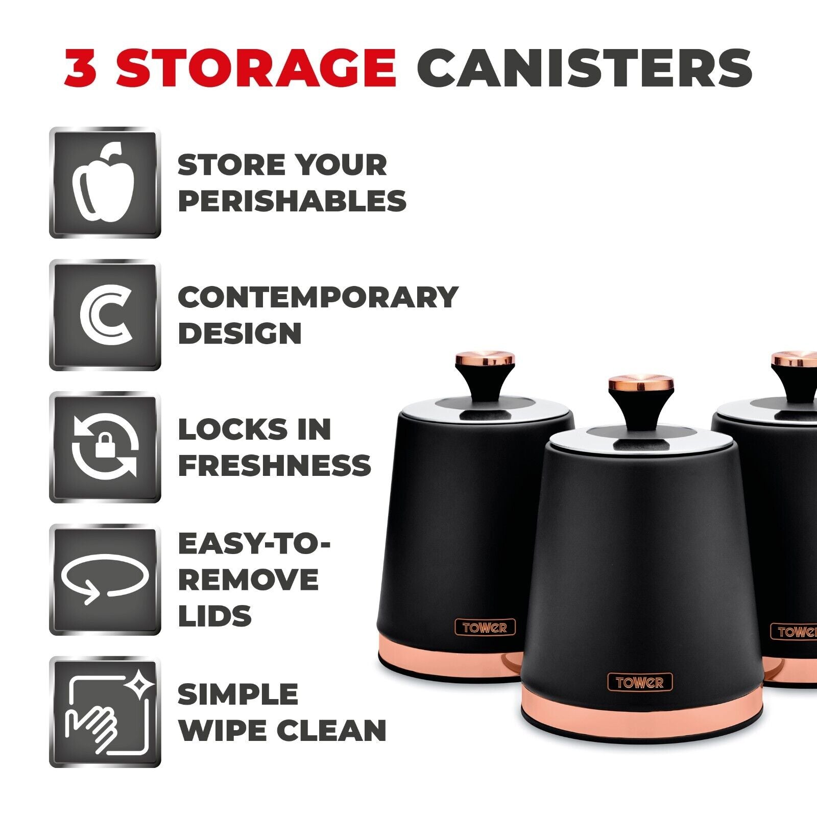 Wrapped in a staple design feature for today's modern home, the durable carbon build of these canisters locks in the freshness of your chosen ingredients, while presenting a reliable and highly styled storage compartment for your teas, coffees and sugars. The carbon structure is finished with a coating of black with rose gold tones for a tasteful finishing touch to compliment your kitchen environment. The removable lids provide maximum access to the inner capacity for easily retrieving of the contents stored inside. Each canister requires only a simple wipe clean to make for easy maintenance of its on-trend finish.