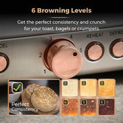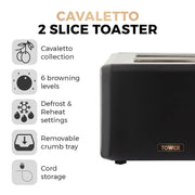 This 2 slice toaster from Tower is an essential appliance that your kitchen needs. Its contemporary black colour scheme is complemented by elegant on-trend rose gold accents, creating an eye-catching addition to a manner of kitchen decors. The slots are a good size for a wide range of loaves, muffins, crumpets and bagels, with up to 6 different browning settings available to cater to your preferences, and ensuring the bread has the right consistency and texture. Also included is a defrost/reheat function, so you can toast straight from frozen in a matter of minutes for a last minute bite to eat. An integrated cord storage and removable crumb tray keeps your kitchen countertop tidy, while the anti-slip feet keep the toaster stable on the surface.