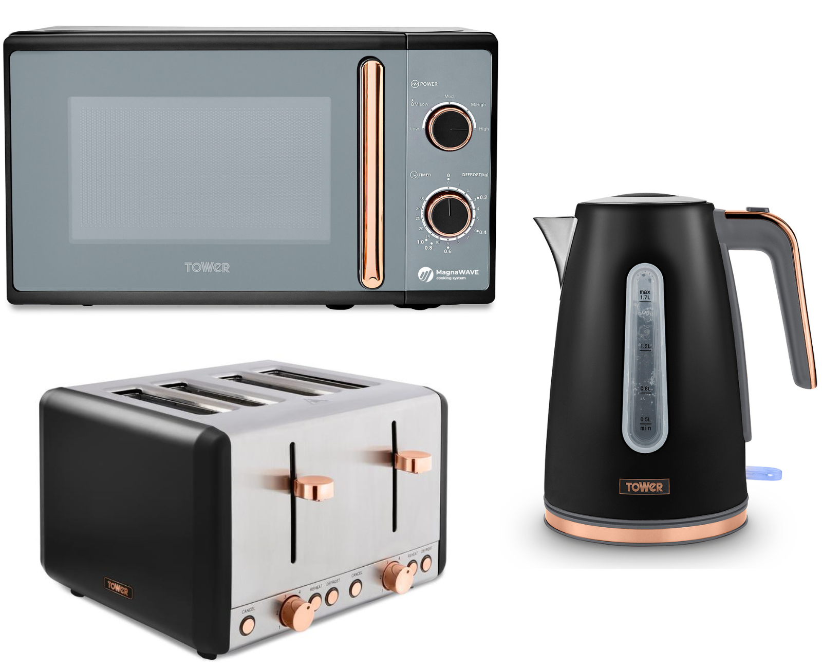 Tower Cavaletto Contemporary Matching KItchen Set in Black & Rose Gold with 1.7L 3KW Jug Kettle, 4 Slice 1800W Toaster & 800W 20L Microwave