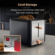 This 2 slice toaster from Tower is an essential appliance that your kitchen needs. Its contemporary black colour scheme is complemented by elegant on-trend rose gold accents, creating an eye-catching addition to a manner of kitchen decors. The slots are a good size for a wide range of loaves, muffins, crumpets and bagels, with up to 6 different browning settings available to cater to your preferences, and ensuring the bread has the right consistency and texture. Also included is a defrost/reheat function, so you can toast straight from frozen in a matter of minutes for a last minute bite to eat. An integrated cord storage and removable crumb tray keeps your kitchen countertop tidy, while the anti-slip feet keep the toaster stable on the surface.