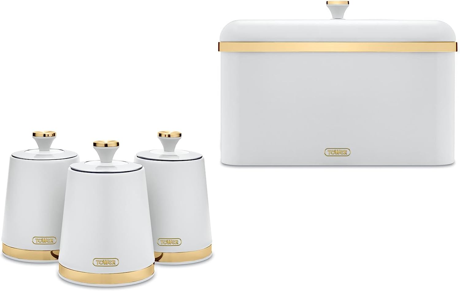 Brand New Tower Cavaletto  Bread Bin  & Set of 3 Tea, Coffee & Sugar Canisters Kitchen Storage Setin Optic White & Champagne Gold.  Fast Dispatch & Free Next Working Day Delivery from UK Stock. Full 2 Year Tower Manufacturer Guarantee