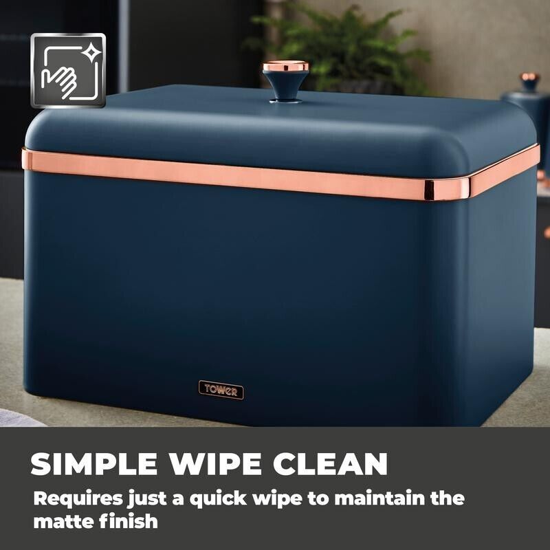 Wrapped in a staple design feature for today's modern home, the durable carbon build of this bread bin presents a reliable and highly styled storage compartment for your baked goods. The carbon structure is finished with a coating of matte midnight blue, with rose gold tones for a tasteful finishing touch to compliment your kitchen environment. The removable bin lid provides maximum access to the inner compartment for easily retrieving of your breads and pastries. This bread bin measures H24 x W33 x D23cm and requires only a simple wipe clean to make for easy maintenance of its on-trend finish.
