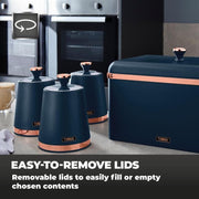Wrapped in a staple design feature for today's modern home, the durable carbon build of these canisters locks in the freshness of your chosen ingredients, while presenting a reliable and highly styled storage compartment for your teas, coffees and sugars. The carbon structure is finished with a coating of Midnight Blue with rose gold tones for a tasteful finishing touch to compliment your kitchen environment. The removable lids provide maximum access to the inner capacity for easily retrieving of the contents stored inside. Each canister requires only a simple wipe clean to make for easy maintenance of its on-trend finish