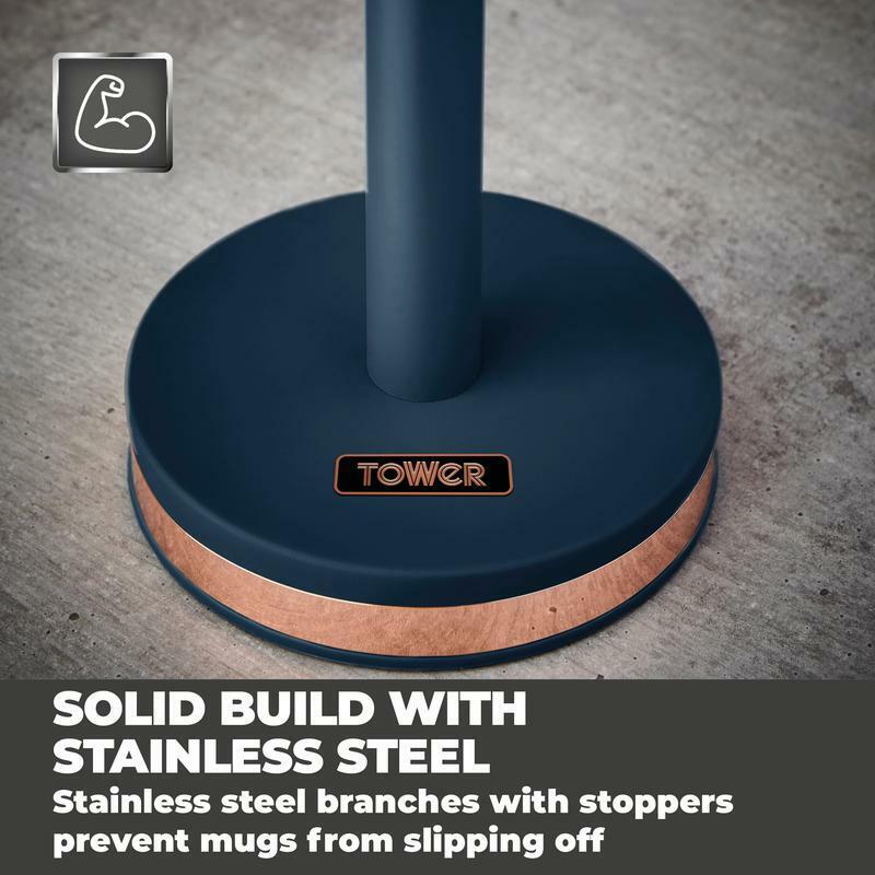 Show off your most prized mug collection with this 6 cup mug tree. Featuring our signature midnight blue Cavaletto design complimented by notes of rose gold, the stainless steel design provides a durable accessory for safely storing your cups. This mug tree can comfortably hold 6 mugs of various sizes, with handy stainless steel stoppers on each of the branches to ensure the cups remain in place. The solid base enhances stability across your work surfaces, complete with a soft underliner to prevent against scratching. Easily maintain the Cavaletto design by performing a simple wipe to clean.