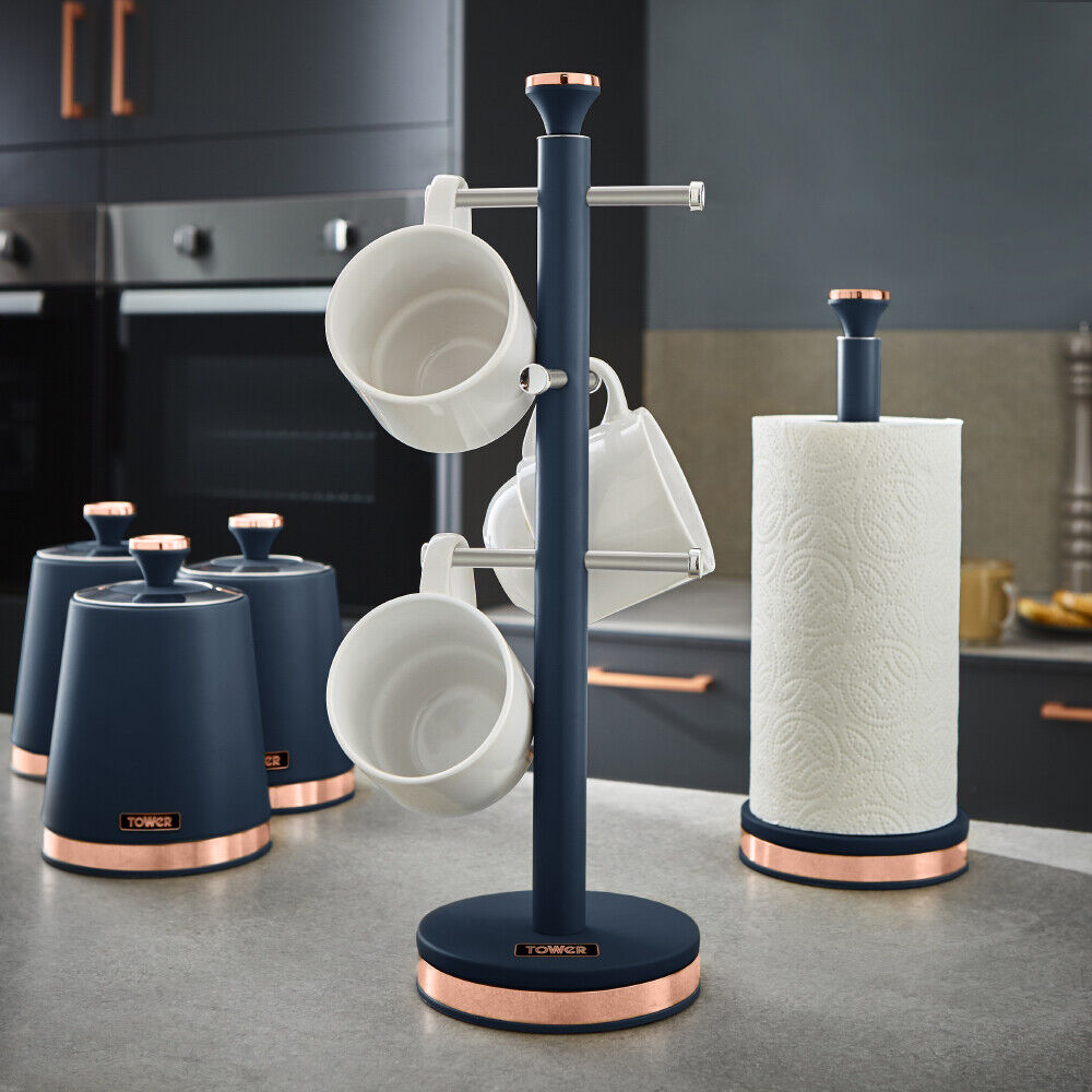 Brand New Tower Cavaletto Jug Kettle, 4 Slice Toaster, Bread Bin, Set of 3 Canisters (Tea, Coffee, Sugar) 6 Cup Mug Tree & Towel Pole Matching Super Set of 8 Kitchen Items in Midnight Blue & Rose Gold. Fast Dispatch & Free Next Day Delivery from UK Stock. Full 3 Year Manufacturer Guarantee