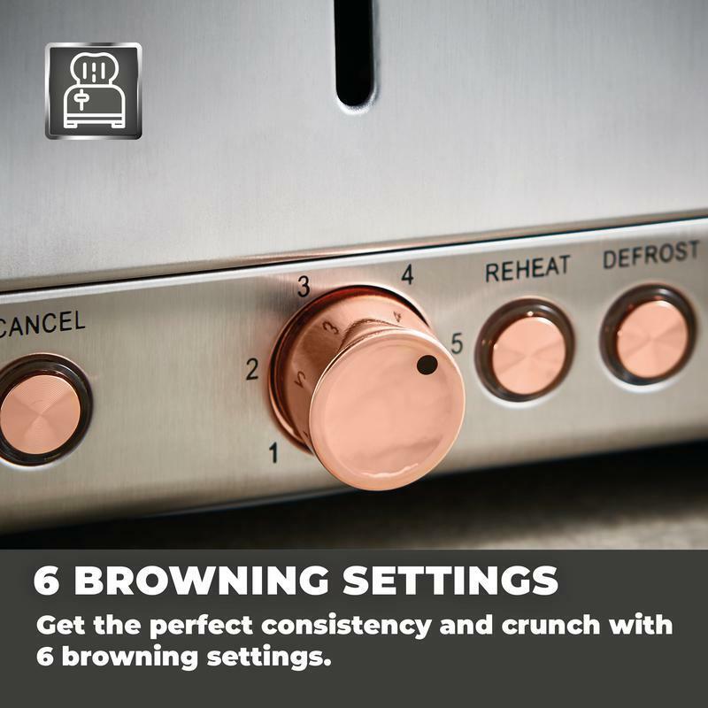 Combining midnight blue and rose gold with a durable stainless steel finish, this Cavaletto 4 slice toaster injects a splash of contemporary design into your breakfast routine. The variable browning controls let you select the perfect toasting texture to suit your taste. Defrost, reheat and cancel options put you in control of the toasting cycle, so you can warm up your snacks or toast straight from frozen. The removable crumb tray captures any excess crumbs to make for easy disposal and to maintain the toaster's quality performance. The integrated cord storage keeps your counter surfaces free from trailing wires.