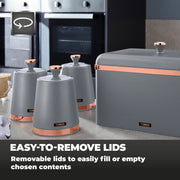 Wrapped in a staple design feature for today's modern home, the durable carbon build of these canisters locks in the freshness of your chosen ingredients, while presenting a reliable and highly styled storage compartment for your teas, coffees and sugars. The carbon structure is finished with a coating of matte grey, with rose gold tones for a tasteful finishing touch to compliment your kitchen environment. The removable lids provide maximum access to the inner capacity for easily retrieving of the contents stored inside. Each canister requires only a simple wipe clean to make for easy maintenance of its on-trend finish.
