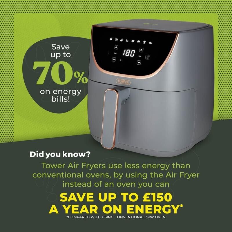 Make family cooking simple with this 6L Digital Air Fryer from Tower. Vortx technology rapidly circulates hot air around the chamber to cook food 30% faster with only a little oil required, perfect for healthy, yet beautifully crisp meals. Enjoy meals with 99% less fat so you get all the great taste with great health benefits. Air Fryers cook faster than a conventional oven and you could save up to 70% on your energy bills by swapping to air fryer cooking. The digital touch panel allows you to set the temperature timer at the touch of a button, with 8 menu pre-sets are designed to bring more variety to meal times. The removable drawer and crisper grill tray both come with a non-stick coating for greater food release and simple cleaning. A 90cm power cord offers the freedom to move anywhere across the work top, whilst a generous 6L basket ensures food can be cooked for the whole family with ease. A cool touch handle ensures improved safety, reducing the chance of burns when opening the fryer.