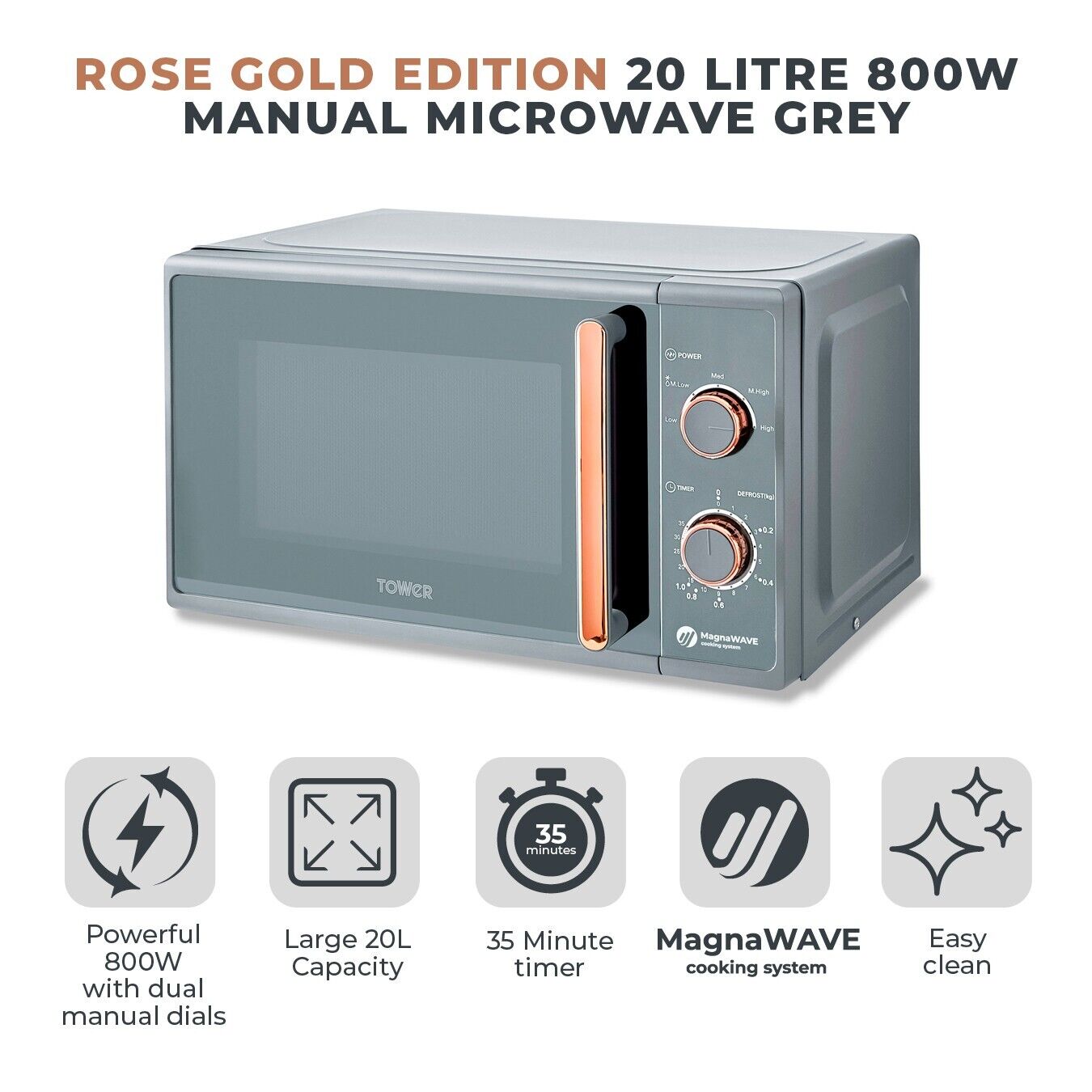 Cook up fuss-free everyday meals for the whole family with this 20L Cavaletto Manual Microwave. Powered by MagnaWave technology, concentrated waves circulate to ensure heat is distributed evenly for a well cooked meal - keeping intense flavours for amazing results with every use. This microwave features a powerful 800W output for faster cooking and heating, with 5 heat settings that can be adjusted to suit your needs. The huge inner 20 litre capacity can easily fit a standard 10 dinner plate, giving you versatility to use large dishes to cook for the whole family. Its 35-minute timer provides enough time to cook your meals with complete precision so they're ready to serve, whilst the defrost function cooks meals from frozen in minutes - ideal for leftovers or a speedy emergency snack. The dual manual controls are easy-to-use to control the heat settings, defrost function cooking time, with a cool touch door handle for easy open and closing.
