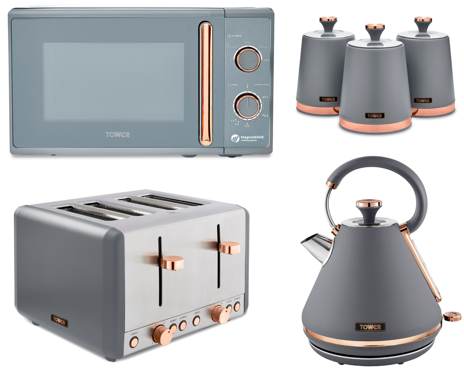 Tower Cavaletto Grey Pyramid Kettle, 4 Slice Toaster, 800W 20L Microwave & Canisters Set