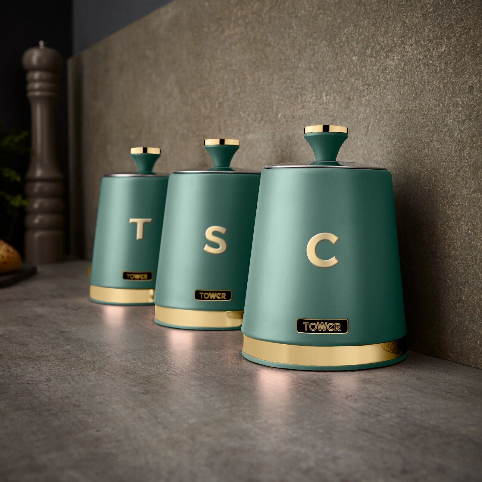 Tower Cavaletto Jade & Gold 3 Canisters Mug Tree Towel Pole Kitchen Storage Set
