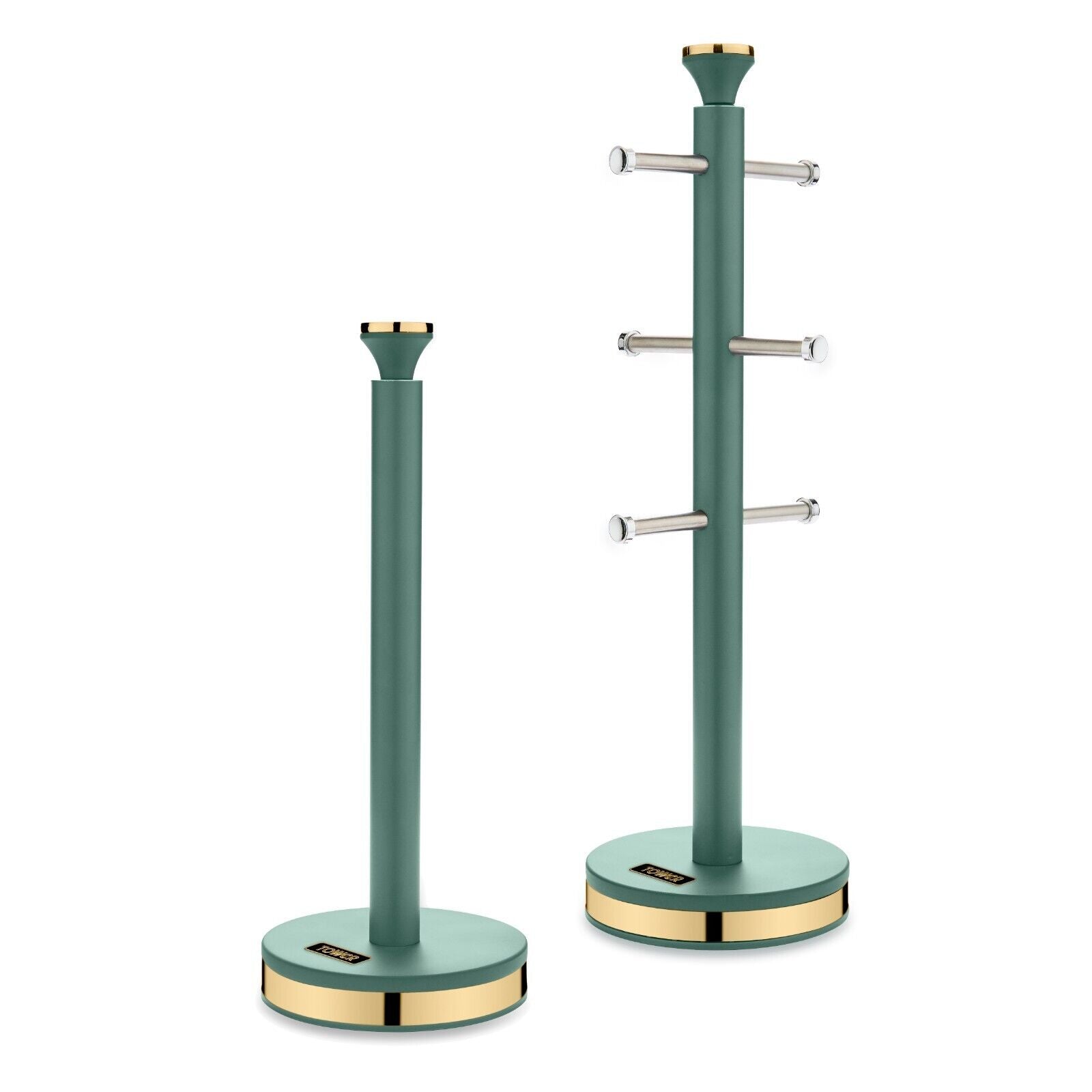 Brand New Tower Cavaletto Kitchen Storage Set including 3 Tea, Coffee & Sugar Canisters, Mug Tree & Towel Pole. Contemporary Matching Kitchen Set of 5 in Jade & Champagne Gold