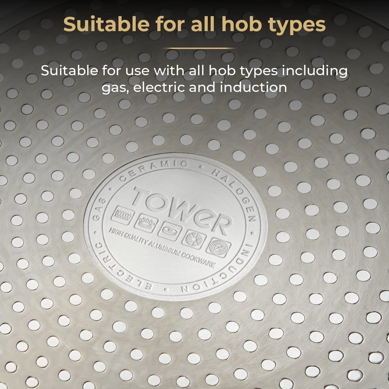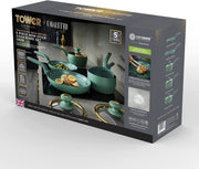 New Tower Cavaletto 5 Piece Pan Set in Jade with Champagne Gold Accents. Brand New UK Stock, Fast Dispatch & Free Next Working Day Delivery. TOWER 5 Year Manufacturer Guarantee