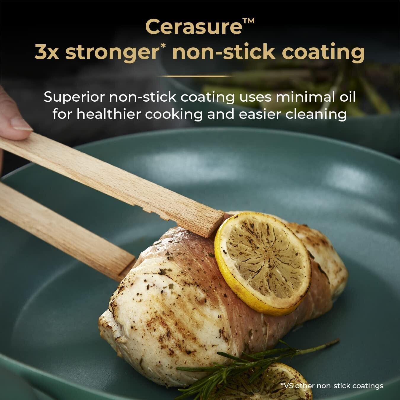 Create delicious, healthy fat-free meals with the Tower Cavaletto 5-Piece Cookware set of 16cm, 18cm, 20cm saucepans and 24cm, 28cm frying pans. With superior Cerasure ceramic coating each pan requires little to no oil for healthier cooking, with exceptional non-stick properties which leaves little residue behind. Each pan features softtex handles in an elegant Jade and Champagne gold finish, for maximum comfort and style when cooking. Featuring a bonded steel base which is compatible with all hob types including gas cookers, electric hobs and induction set-ups. Each pan is crafted from pressed aluminium with expert heat transfer, for overall quicker and more efficient cooking. Its aluminium body is free from PFOA, PFAS, PTFE, Lead and Cadmium. This trendy 5-piece cookware set is coated in Jade with brushed champagne gold accents, perfectly styled with other essentials in the Cavaletto collection.