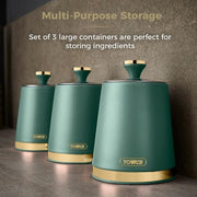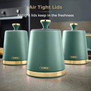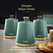 Lock in the freshness of your favourite hot beverages and other foods with Tower's tasteful set of three Cavaletto canisters, ideal for storing anything from coffee, sugar, and tea, to dry pasta and rice on your countertop. The steel framework enhances its durability, keeping products at quality standards. Each of the containers has a 1.3 litre capacity to store your loose ingredients in a tidy manner, preventing cluttered kitchens. With the removable airtight lids, your favourite ingredients will be kept fresh for longer and makes it easy to replenish them. The contemporary style emphasizes sleek flair with its tasteful matte Jade finish with champagne gold accents. Complete the set with the Cavaletto collection to add a modern touch to your kitchen.