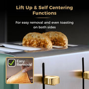 Cavaletto 4 Slice Toaster in Jade with Brushed Champagne Accents Serve up to four slices of freshly-toasted bread, crumpets or bagels with the Tower Cavaletto 4-slice toaster. With variable browning settings, you have more control over the toasting time to get the texture and taste which suits you best. The defrost, reheat and cancel options offer more functions, allowing you lightly warm up snacks or toast bread straight from frozen for a quick breakfast solution. The removable tray makes it easy to dispose of excess crumbs to keep your countertop clean, with cord storage to keep your surface neat and free from wires. Finished in stainless steel with Jade and champagne colouring, the Cavaletto toaster complements the look of your kitchen countertop. |