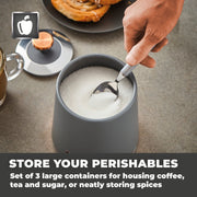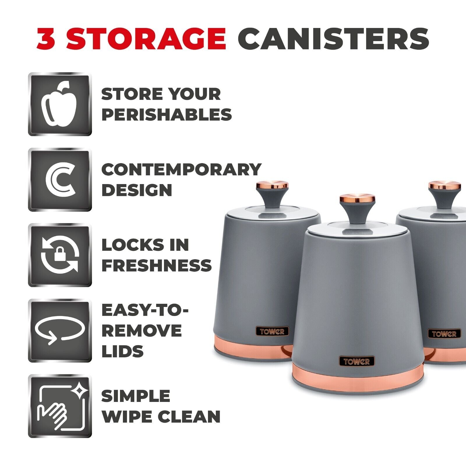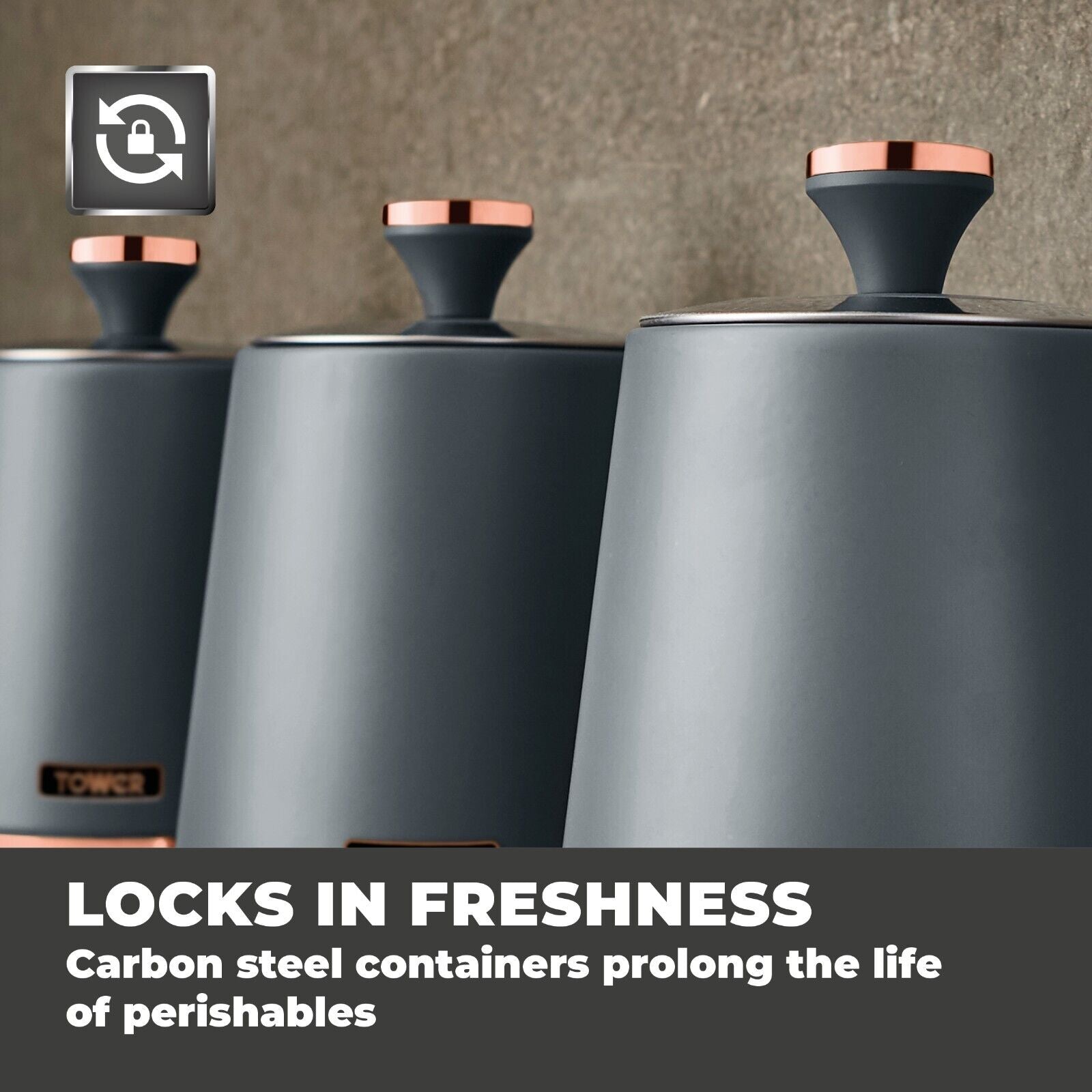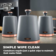 Wrapped in a staple design feature for today's modern home, the durable carbon build of these canisters locks in the freshness of your chosen ingredients, while presenting a reliable and highly styled storage compartment for your teas, coffees and sugars. The carbon structure is finished with a coating of grey with rose gold tones for a tasteful finishing touch to compliment your kitchen environment. The removable lids provide maximum access to the inner capacity for easily retrieving of the contents stored inside. Each canister requires only a simple wipe clean to make for easy maintenance of its on-trend finish